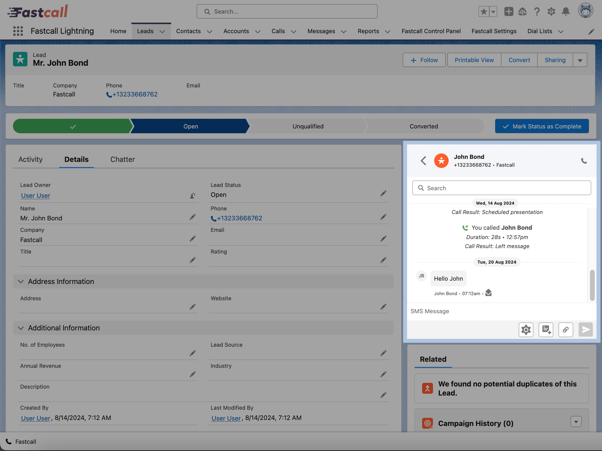 The Fastcall interaction component it’s a Lightning Component optionally added to the page layout that allows multiple users to interact with the Lead or Contact.